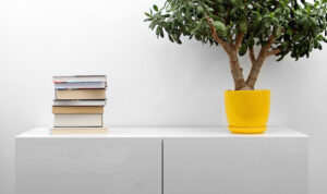 white commode with stack of books and flower pot in bright minimalism interior