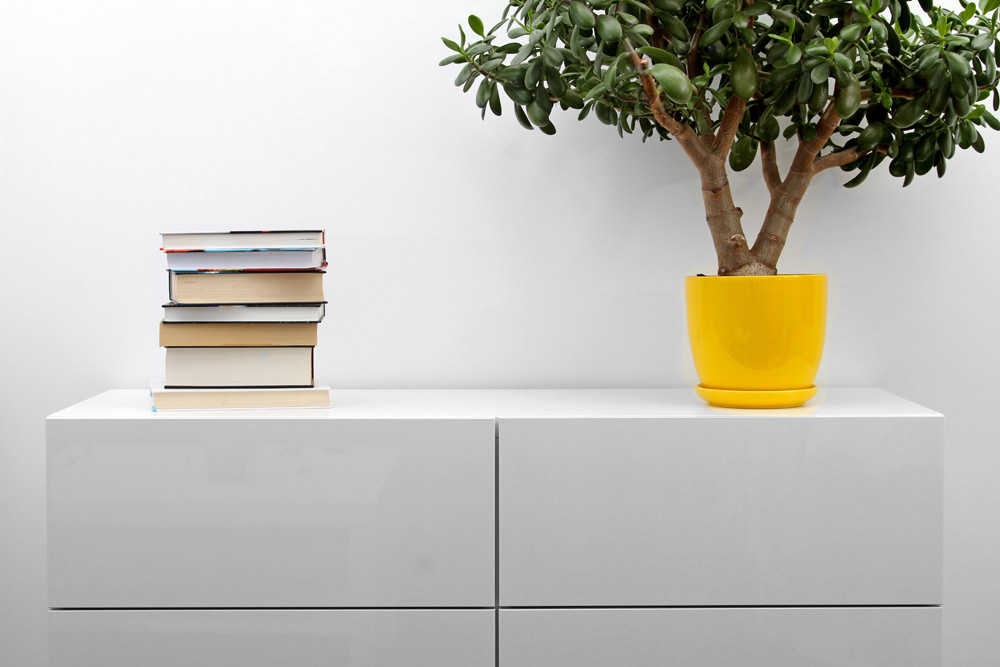 white commode with stack of books and flower pot